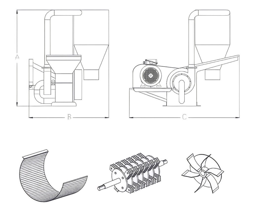 | MOTOR GÜCÜ (kw) | KAPASİTE(kg-saat) | AĞIRLIK(kg) | BIÇAK SAYISI | ELEK ÇAPI Ø(mm) | A(mm) | B(mm) | C(mm) |